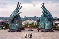 「守護之翼」紀念碑前遊客合影留念,遠方是神鳥迦樓羅造型的總統府。印尼新首都努山塔拉,原本為解決雅加達的危機而生,如今正面臨考驗。