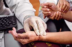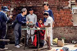 二○二三年慈濟志工走入印度北部菩提迦耶,在尼連禪河邊蓋建大愛村,創造工作機會;一對腳部殘疾的裁縫夫妻接下縫製福慧袋工作,協力布施。