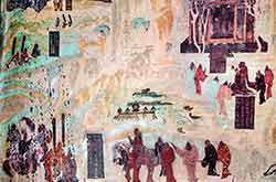 敦煌莫高窟第三二三窟北壁的《張騫出使西域圖》。張騫通西域,為漢傳佛教的重要里程碑,佛教便是從絲綢之路由西域傳入中國。