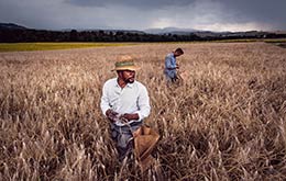 技術人員在實驗麥田裡收集麥穗,目標為高拉山小麥,因為其質量是一般小麥的兩倍。因應全球氣候異常,農業品項與技術也被迫做出應變。